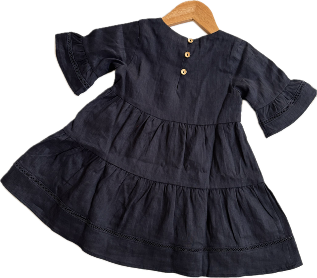 Gracefully simple and effortlessly charming, this little girls’ dress is made from breathable linen that flows with every step. Its lightweight design keeps her cool and comfortable, while delicate lace trim adds a whisper of vintage sweetness. A row of buttons down the back completes the look with classic detail. Perfect for sunny strolls, family gatherings, or twirling in the garden, this dress blends timeless style with everyday ease.
